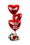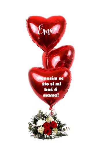 Dekoracija sadrži 3 folijska balona u obliku srca dimenzije cca 48 cm puhani na helij. Zavezani na ukrasni uteg. Na jednom od folijskih balona se nalazi naljepnica sa predloženim tekstom a na drugom sa imenom.