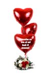 Dekoracija sadrži 3 folijska balona u obliku srca dimenzije cca 48 cm puhani na helij. Zavezani na ukrasni uteg. Na jednom od folijskih balona se nalazi naljepnica sa predloženim  tekstom.