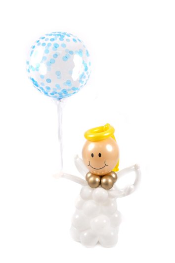 Dekoracija je prigodna za krštenje, pričesti i krizme, a sastoji se od figure anđela i bubble balona na helij. Bubble balon ima plave točkice i veličine je oko 50 cm.
