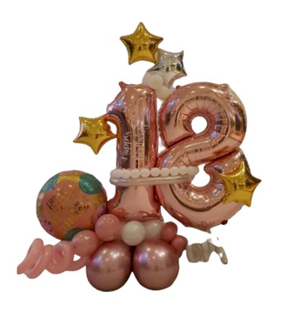 Dekoracija sadrži folijske balone: 2 broja, 4 mini zvjezdice, i 1 balon u obliku kruga veličine oko 45 cm. Folija baloni stoje na postolju od latex balona, te su svi puhani na zrak.