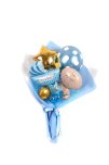 Buket je prigodan za izlazak djeteta iz rodilišta. Dekoracija sadrži 6 mini folija i 1 latex balon puhan na zrak na držačima skupljenim u buket.