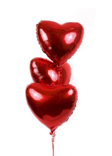 - 3 crvena folijska srca veličine 48 cm napuhanih na helij, zavezanih na ukrasni uteg.