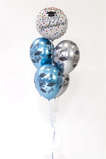 Bunt balona na helij sadrži 4 latex balona sa impergnacijskim gelom (kako bi duže letjeli) s motivima diplomskih kapica, a na vrhu buntića nalazi se folija balon u obliku kruga "Happy graduation", veličine oko 45 cm. Baloni su zajedno spojeni dekorativnom mašnom od modeling balona i privezani na ukrasni uteg.
