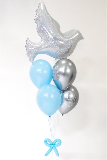Bunt balona na helij sadrži 4 latex balona sa impergnacijskim gelom (kako bi duže letjeli), a na vrhu buntića nalaze se folija balon u obliku golubice veličine oko 70 cm. Baloni su zajedno spojeni dekorativnom mašnom od modeling balona i privezani na ukrasni uteg.