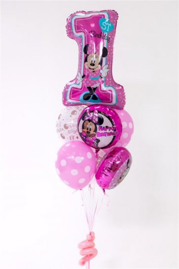 Bunt balona na helij sadrži: 2 folijska balon u obliku kruga sa likom Minnie Mouse veličine 45 cm i 4 latex balona sa impergnacijskim gelom (kako bi duže letjeli). Na vrhu buntića nalazi se broj jedan visine 74 cm. Baloni su zajedno spojeni dekorativnom frčkom od modeling balona i privezani na ukrasni uteg.
