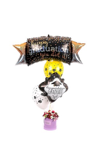 Bunt balona sadrži 2 lateks balona na helij s crnim tiskom diplomskih kapica, 1 folija balon na vrhu širine 80 cm, 1 folija balon veličine 45 cm i dekorativni uteg. Uz bunt balona u paketu je i prekrasni box cvijeća.