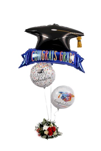 Bunt balona sadrži 2 lateks balona na helij s crnim tiskom diplomskih kapica, 1 folija balon na vrhu širine 80 cm, 2 folija balona veličine 45 cm, te dekorativni uteg. Uz buket balona u paketu se nalazi i prekrasni buket cvijeća iz cvjećarnice Vanjorek.