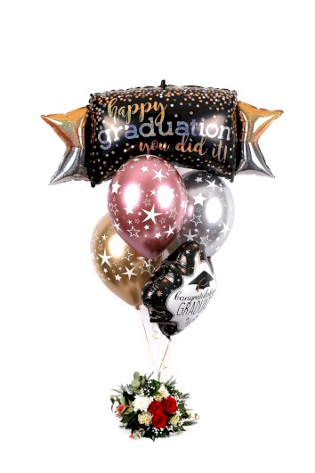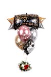 Bunt balona sadrži 3 shiny lateks balona na helij s bijelim tiskom zvjezdica, 1 folija balon na vrhu širine 80 cm, 1 folija balon veličine 45 cm, te dekorativni uteg. Uz buket balona u paketu se nalazi i prekrasni buket cvijeća iz cvjećarnice Vanjorek.