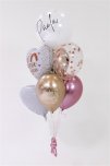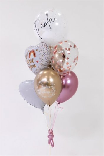 Bunt balona na helij sadrži: 2 folijska balona u obliku srca veličine oko 45 cm, te 5 latex balona sa impergnacijskim gelom (kako bi duže letjeli) i 1 personalizirani latex balon od 48 cm na vrhu. Baloni su zajedno spojeni dekorativnom frčkom od modeling balona i privezani na ukrasni uteg.