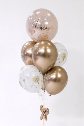 Bunt balona na helij sadrži 6 latex balona sa impergnacijskim gelom (kako bi duže letjeli), a na vrhu buntića nalaze se personalizirani bubble balon s natpisom po želji, veličine oko 60 cm. Baloni su zajedno spojeni dekorativnom mašnom od modeling balona i privezani na ukrasni uteg.