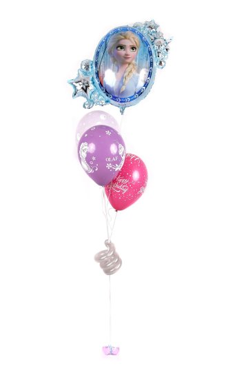 Bunt balona na helij sadrži: 1 folijski balon Frozen veličine oko 80 cm (s jedne strane je lik Else, a s drugi Anne) i 3 latex balona sa impergnacijskim gelom (kako bi duže letjeli). Baloni su zajedno spojeni ukrasnom frčkom od modeling balona i privezani na ukrasni uteg.