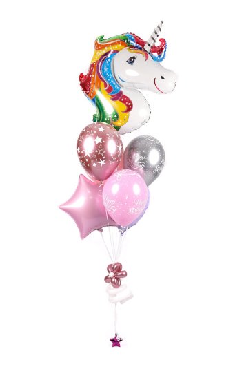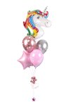 Bunt balona na helij sadrži: 1 folijski balon u obliku jednoroga, 4 latex balona sa impergnacijskim gelom (kako bi duže letjeli), te dva folija balona veličine 45 cm, jedan u obliku srca i jedan u obliku zvijezde. Baloni su zajedno spojeni dekorativnim cvjetićem i privezani na ukrasni uteg.
