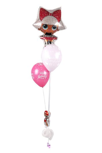 Bunt balona na helij sadrži: 1 folijski balon u obliku LOL lutkice i 2 latex balona sa impergnacijskim gelom (kako bi duže letjeli). Baloni su zajedno privezani na ukrasni uteg uz koji se nalazi i mini folija balon u obliku LOL lutkice i ukrasna frčka od modeling balona.