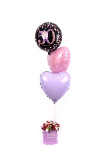 Dekoracija je prigodna za proslavu 50. rođendana. Bunt se sastoji od tri folijska balona veličine 45 cm, od kojih su dva u obliku srca i jedan u obliku kruga. Baloni privezani na dekorativni uteg. Uz bunt balona dolazi prekrasan box cvijeća.