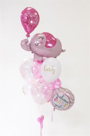 Bunt balona na helij sadrži: 1 folija balon u obliku kruga s natpisom "Welcome baby", 6 latex balona sa impergnacijskim gelom (kako bi duže letjeli) od kojih su dva prozirna s konfetima, a na vrhu buntića nalazi se folija balon u obliku slonića veličine oko 70 cm. Baloni su zajedno spojeni dekorativnom mašnom od modeling balona i privezani na ukrasni uteg.