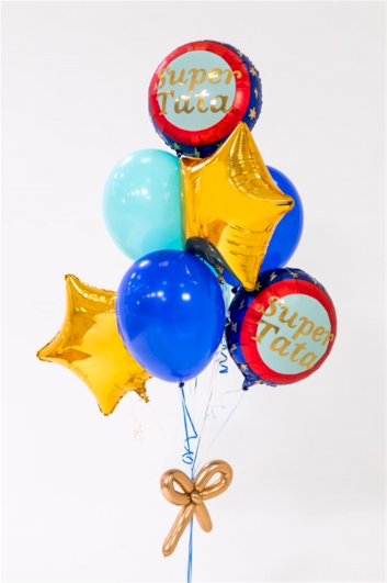 Bunt balona na helij sadrži 4 folijska balon: 2 u obliku zlatnih zvjezdica i 2 u obliku kruga "Super tata" veličine 45 cm, te 4 latex balona u plavim nijansama sa impregnacijskim gelom (kako bi duže letjeli). Baloni su zajedno spojeni dekorativnom mašnom od modeling balona i privezani na ukrasni uteg.