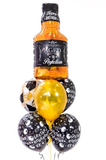 Bunt balona na helij sadrži jedan folijski balon u obliku kruga s natpisom "Happy birthday" veličine 45 cm, te 5 latex balona sa impergnacijskim gelom (kako bi duže letjeli). Na vrhu buntića nalazi se balon u obliku boce viskija veličine 86 cm. Baloni su zajedno spojeni dekorativnom mašnom od modeling balona i privezani na ukrasni uteg.