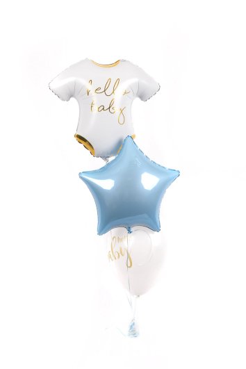 Dekoracija sadrži 2 folijska balona: jedan u obliku plave zvjezdice i jedan u obliku srca dimenzije cca 48 cm, te jedan latex balon s tiskom.