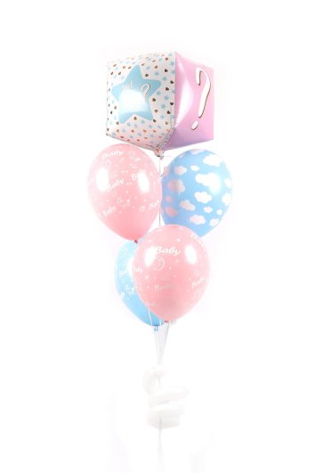 Dekoracija sadrži 5 balona: jedan u obliku kocke "boy or girl" (veličina balona oko 60 cm) i 4 latex balona s tiskom (iznutra premazani impregnacijskim gelom, kako bi duže letjeli).