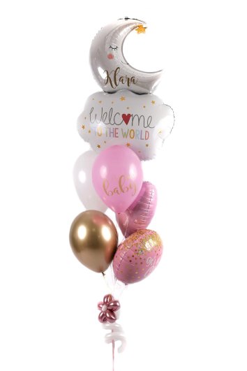 Dekoracija sadrži 6 balona: jedan u obliku oblaka i mjeseca s personaliziranom naljepnicom (veličina balona oko 80 cm), 3 latex balona (iznutra premazani impregnacijskim gelom, kako bi duže letjeli) i 2 folija balona veličine oko 45 cm.