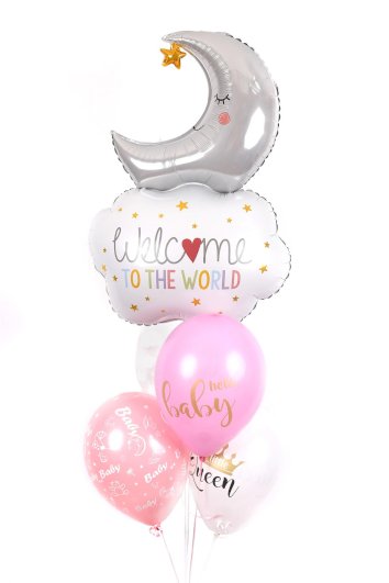 Dekoracija sadrži 5 balona: jedan u obliku oblaka i mjeseca (veličine cca 80 cm) i 4 latex balona s tiskom, iznutra premazani impregnacijskim gelom, kako bi duže letjeli.
