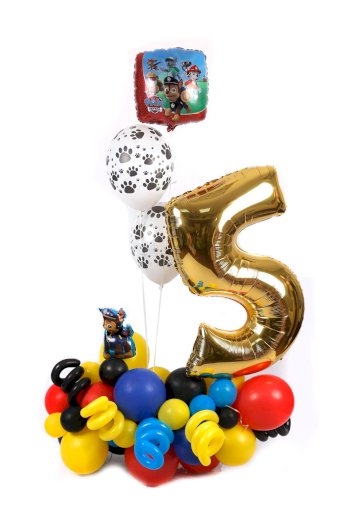 Dekoracija sadrži 3 folijska balona: jedan u obliku mini Chasea iz crtića Paw Patrol, jedan u obliku broja veličine 1 m, te jedan veličine oko 45 cm s likovima Paw Patrol. Baloni stoje na postolju od latex balona različitih veličina napuhanih na zrak. U dekoraciji se nalaze i pet frčkica od modeling balona.