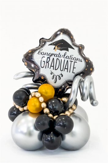 Dekoracija sadrži lateks balone koji čine postolje za folija balon prigodnu za proslavu diplome. Na postolju se nalaze i drugi oblici, kao na primjer frćkica od modeling balona.