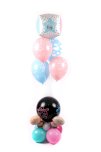 Dekoracija prigodna za otkrivanje spola bebe. Dekorativni klaster se sastoji od 8 latex balona napuhanih na zrak, a na njemu se nalazi crni neprozirni latex balon "boy or girl", predviđen za bušenje i otkrvanje spola bebe. Crni balon je napuhan na zrak i punjen konfetima odgovarajuće boje. Na klasteru se nalaze i dvije mini folije puhane zrakom u obliku beba dječaka i djevojčice.