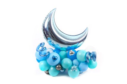 Dekoracija sadrži oblak od latex balona na kojem se nalazi 1 folijski balon u obliku polumjeseca dimenzije cca 1 m i 3 mikro folije u obliku srca i zvjezdice, te frćke od shiny modeling balona. Svi baloni su puhani na zrak.