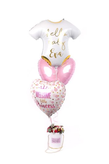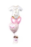 Dekoracija sadrži 3 folijska balona: jedan u obliku dječjeg bodija i 2 srca dimenzije cca 48 cm, od kojih je jedan personalizirani (sadrži naljepnicu s imenom).