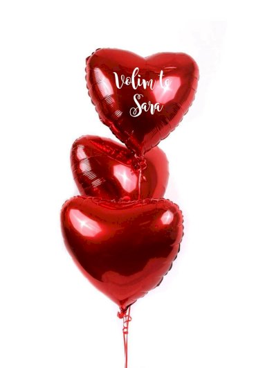 - 3 balona crvena folijska srca veličine 48 cm na helij, zavezanih na ukrasni uteg - od kojih jedno personalizirano srce.