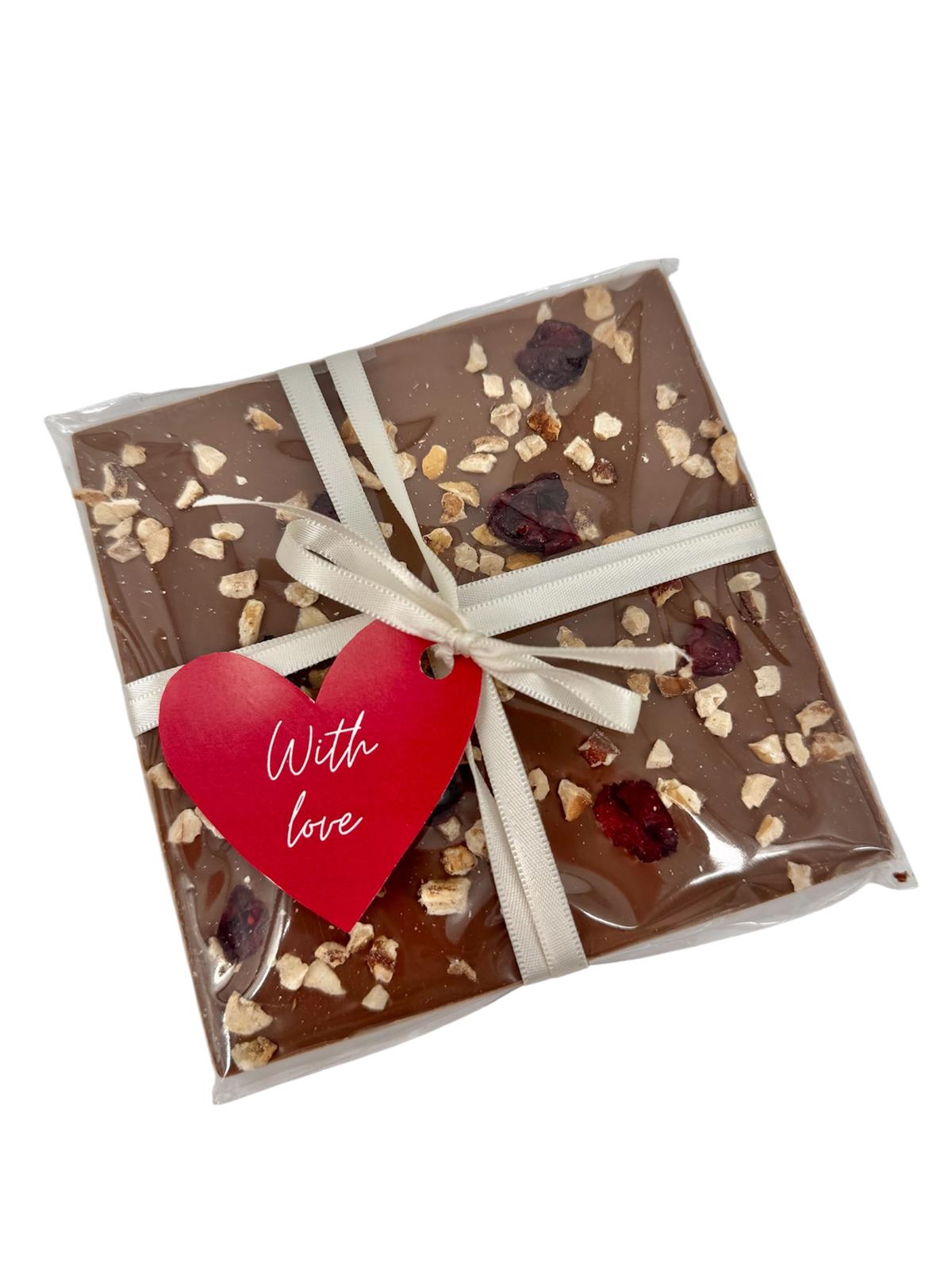 - ručno rađenu čokoladu s posipom lješnjaka i suhe brusnice (100 g)