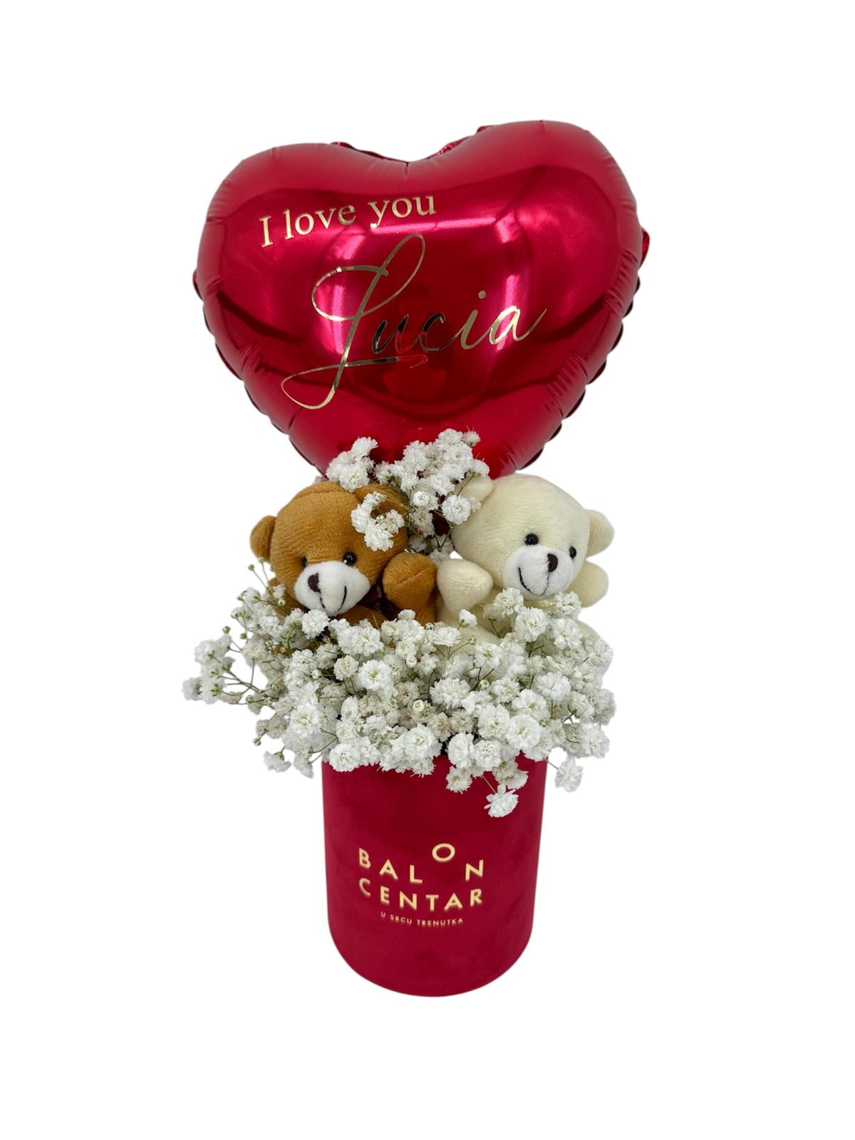Poklon box s medekima i šlajerima romantičnog i slatkog dizajna, poseban je poklon za Valentinovo. Spoj nježnih detalja i personalizirane poruke čini ga idealnim načinom da pokažeš koliko ti je stalo. U napomenu narudžbe slobodno napiši ime ili mini tekst koji želiš da piše na balonu.